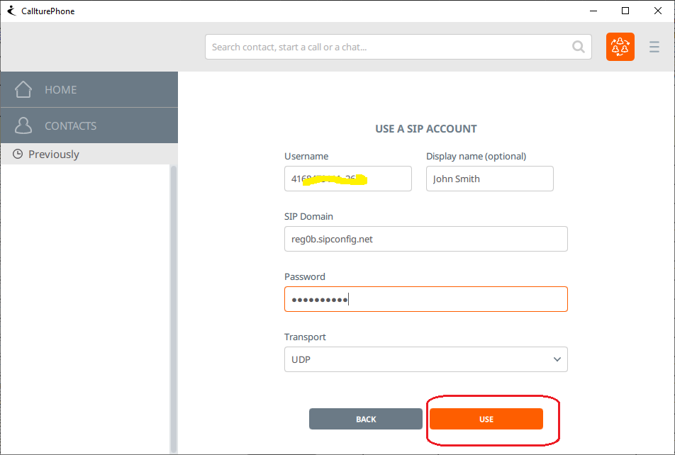Step 2 - Open the app and on the main page click on "USE a SIP ACCOUNT" button, enter the information and click on "USE" button