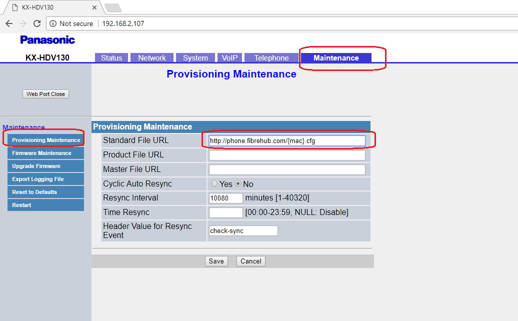 4. On Web UI click on Maintenance tab => Provisioning Maintenance => Standard File URL and put this URL: http://phone.fibrehub.com/{mac}.cfg
